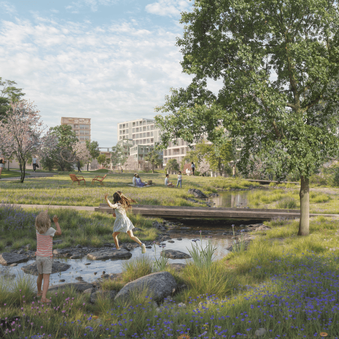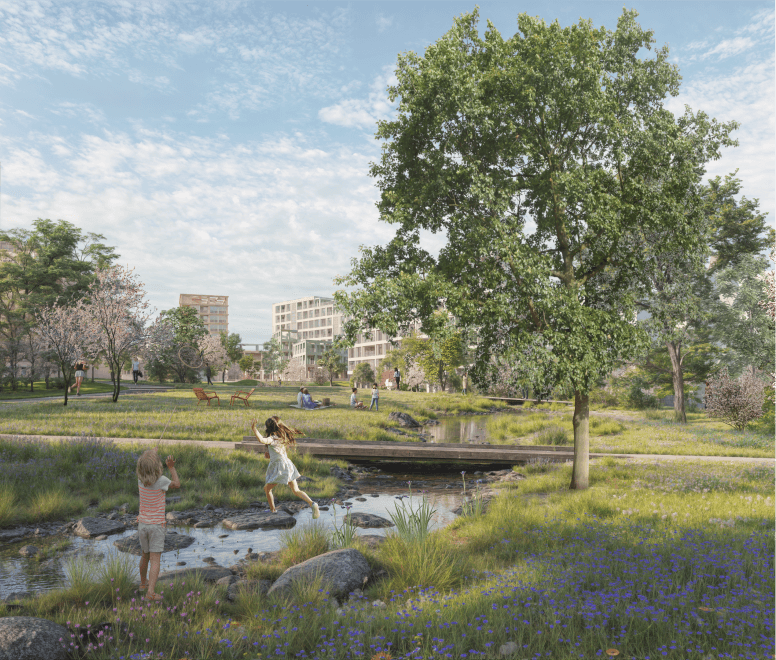 Park centralny, zielone skwery, ścieżki rowerowe i kreatywne place zabaw wkomponowane w osiedle i otwarte dla mieszkańców miasta.