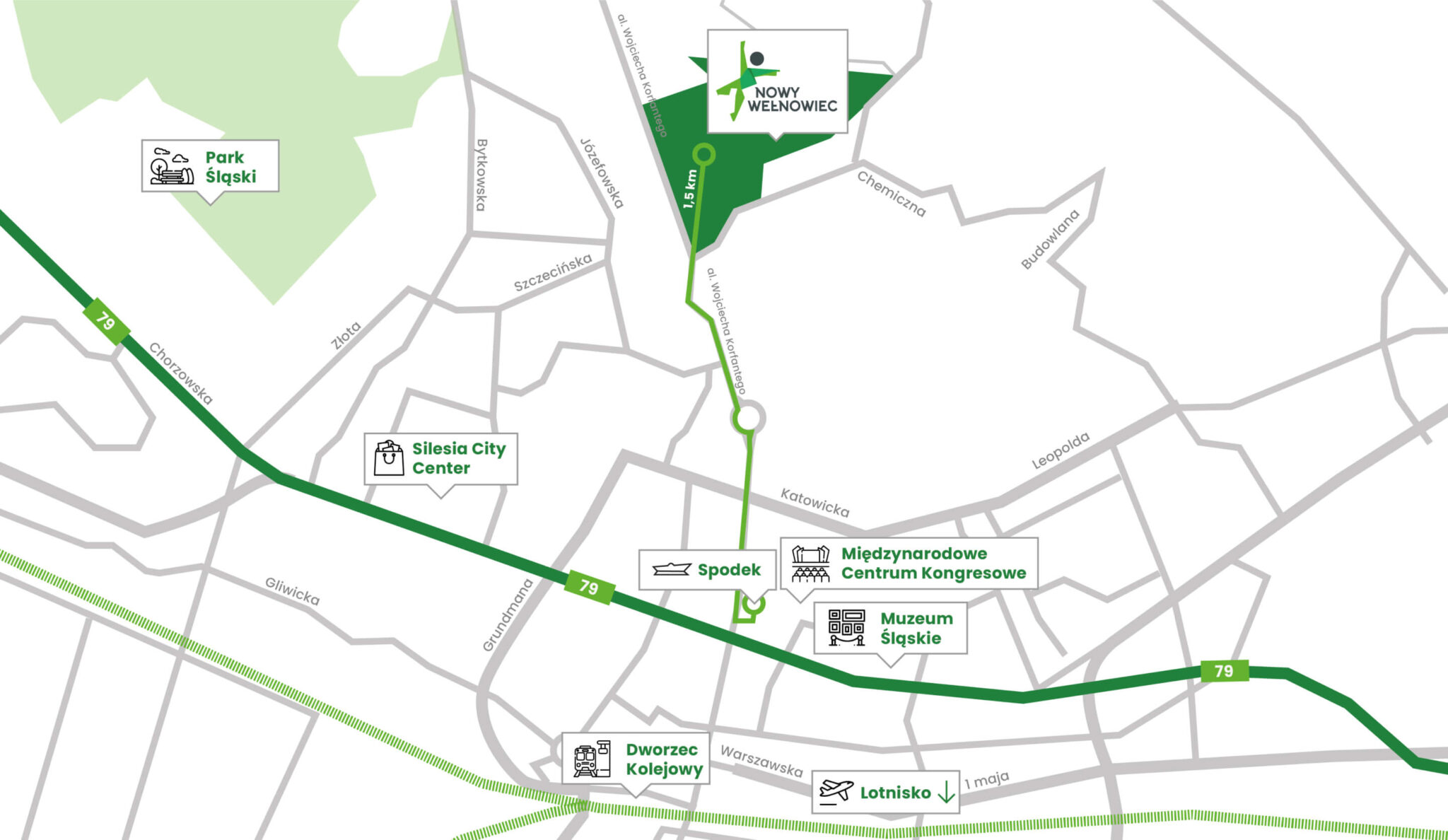 Inwestycja znajduje się blisko centrum Katowic – w dzielnicy Wełnowiec, w rejonie alei Wojciecha Korfantego i ulicy Konduktorskiej. Nowy Wełnowiec położny jest ok. 1,5 km od Spodka i 2,5 km od Dworca PKP i Dworca Autobusowego. Wzdłuż terenów inwestycyjnych przebiega linia tramwajowa oraz linie miejskiej komunikacji autobusowej. Przestrzeń jest znakomicie skomunikowana, dlatego z miejsca będą mogli swobodnie korzystać nie tylko mieszkańcy dzielnicy i okolic, ale także Katowic oraz Górnośląsko – Zagłębiowskiej Metropolii.